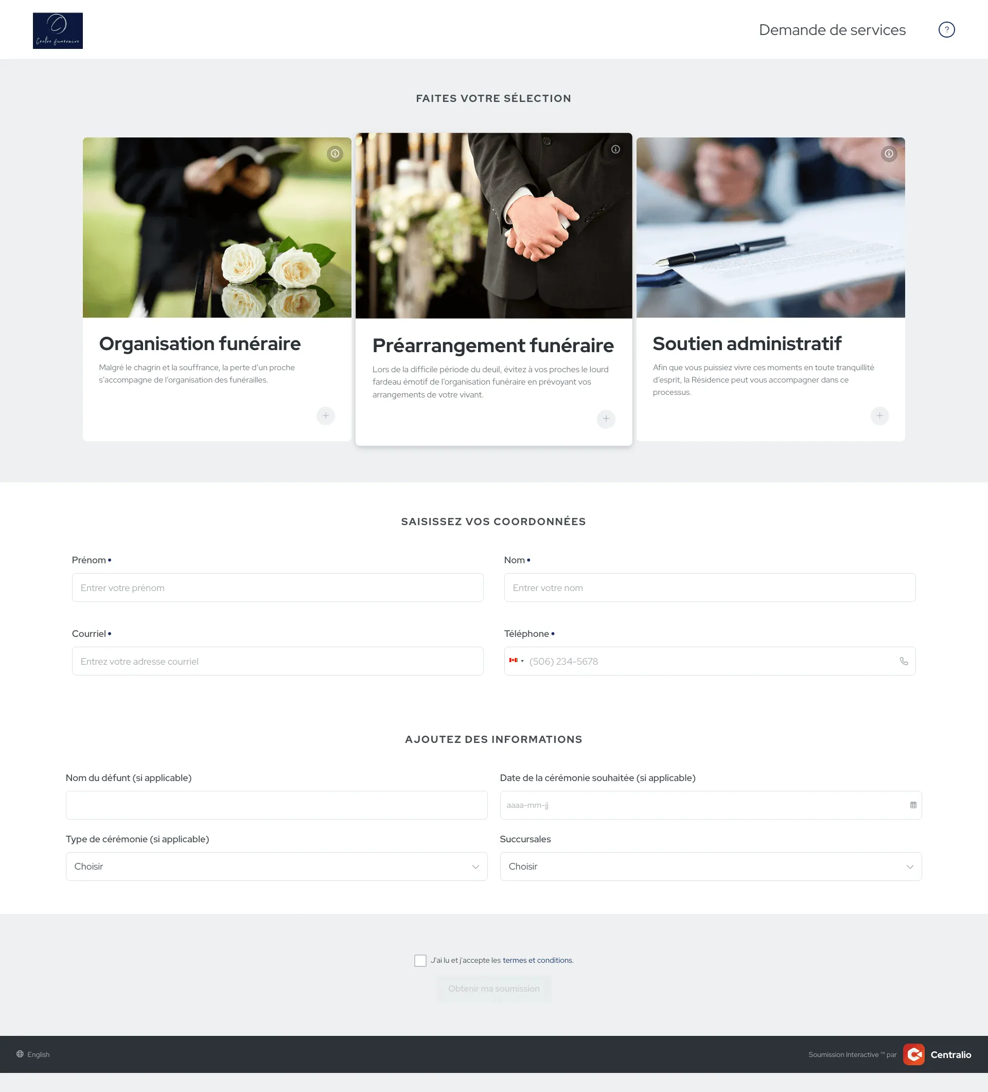 Centralio est une solution québécoise conçue pour répondre à la réalité des établissements funéraires d’ici. Célébrez l’humain en rehaussant votre processus de proposition de services destiné aux individus et aux familles qui font appel à votre expertise. Offrez une expérience d’accompagnement et de sélection de services de haut niveau, tout en bénéficiant de fonctionnalités qui simplifient la planification et facilitent la gestion des opérations.